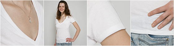 The stitches in jersey knit fabrics are a lot closer together and hard to see unless you get really, really close. The pattern is a square criss-crossing type and the fabric is most often used to make t-shirts. There is a very slight stretch with jersey fabric, especially the single knitted type, and it is very soft and lightweight. A good example of this comfortable fabric is our Women’s Deep V-Neck Shirt which has a form fitting and comfortably smooth feel.