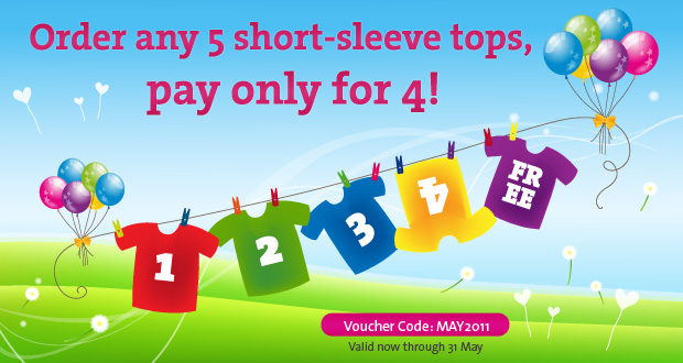 Only until 31 May at the stroke of midnight will you be able to get 5 shirts for the price of 4. It’s been a while since my algebra class, but my pocket calculator tells me that’s a FREE t-shirt!