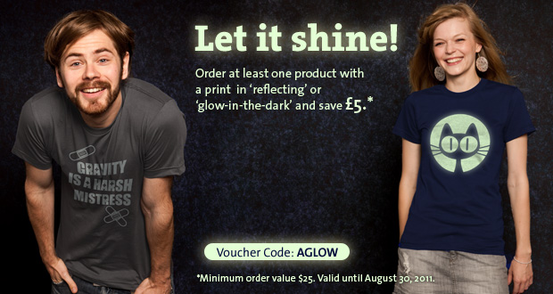 From 16 to 30 August, you can save £5 on your order if your basket has at least one product with “reflective” or “glow in the dark”. Simply enter the voucher code AGLOW when checking out (minimum order value of £25). Also valid in Spreadshirt Partner shops.