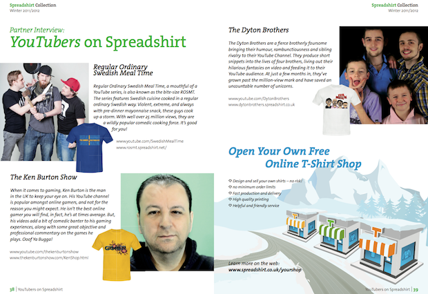 Our winter print catalog is being printed up as we speak and they’ll soon be added to your orders at Spreadshirt. This time we decided to feature three YouTubers who have a Spreadshirt shop to show our customers the kind of diversity we have in our shop partners. The image above is that very page from our catalog – and here’s what we had to say: