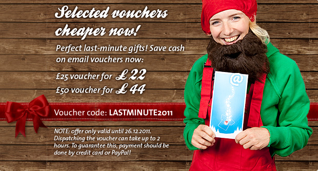 Simply use the voucher code LASTMINUTE2011 when checking out with a voucher in your basket. It may take up to two hours for your voucher to be delivered. Save yourself the trouble, time and stressful trip to the store and let your gift recipients choose the exact size, colour and custom product they want!