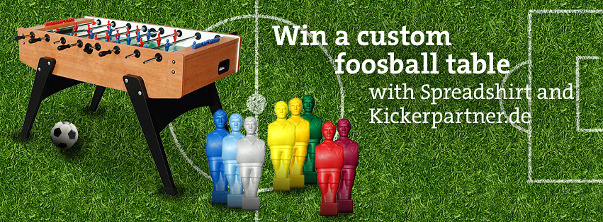 For this years finals Spreadshirt and kickerpartner.de are giving away a customizable foosball table. You’ll pick the colour of the players, choose between two colours for the table and we’ll have your Euros quote or comment printed on the playing field.