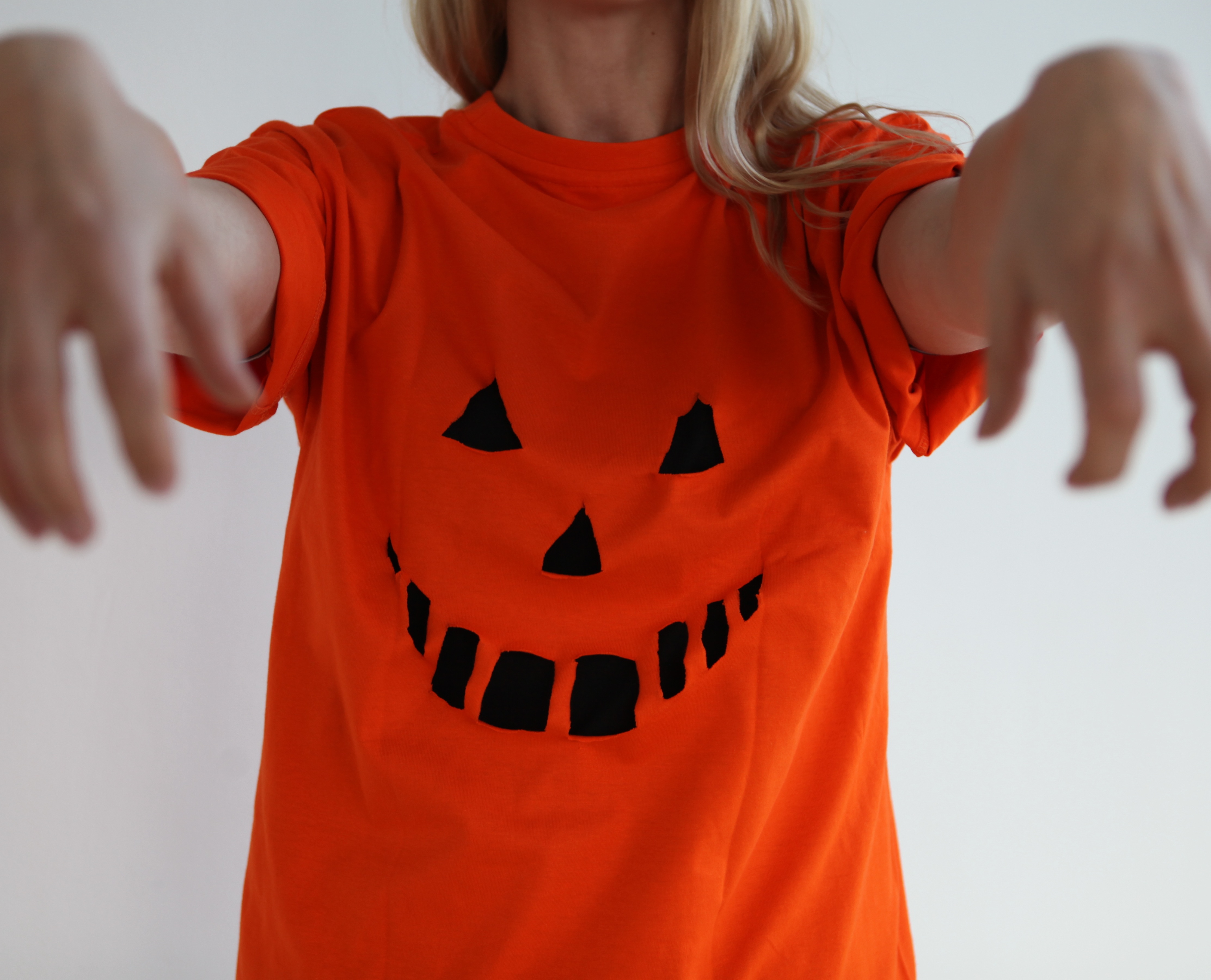 Draw a pumpkin face with chalk on a black t-shirt. Then cut out the inner lining to carve out the face. Then turn the black t-shirt inside out and pull over the orange t-shirt. And off you go!