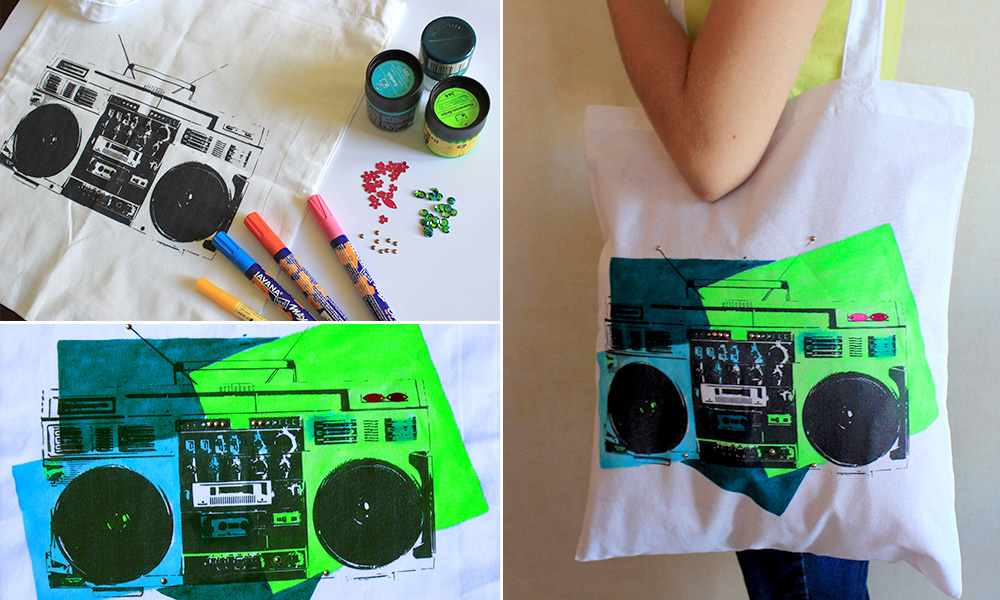 – liquid fabrics ink in 3 different colours, preferably light ones or neon colours. Well-covering paint should be diluted so that the design can still be seen.