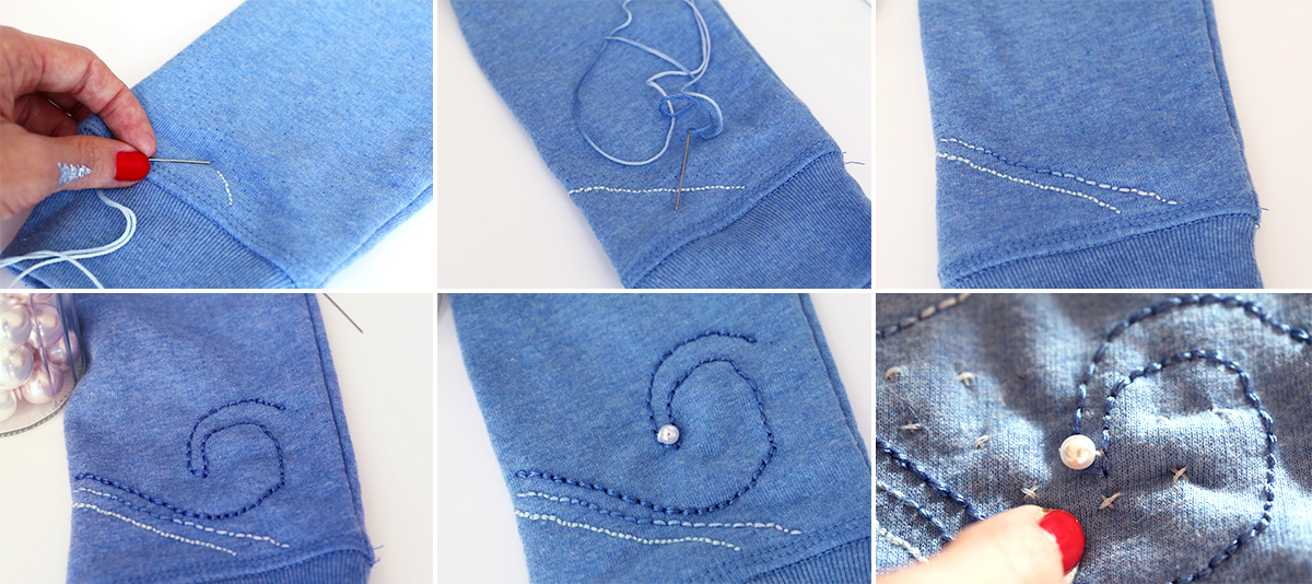 Once you have transferred the dots to your jumper, you only need to embroider the wave pattern. I used a variety of blue nuances to bring out a bold relief. The inner lines were made with multicoloured Tie & Dye thread, and the contours were accentuated by blue satined thread.