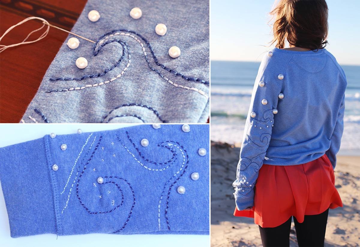First I drew a wave pattern on paper and then transferred the main dots directly onto the jumper. If you don’t feel like transferring the design freestyle, you can also use tracing paper as described in this tutorial.